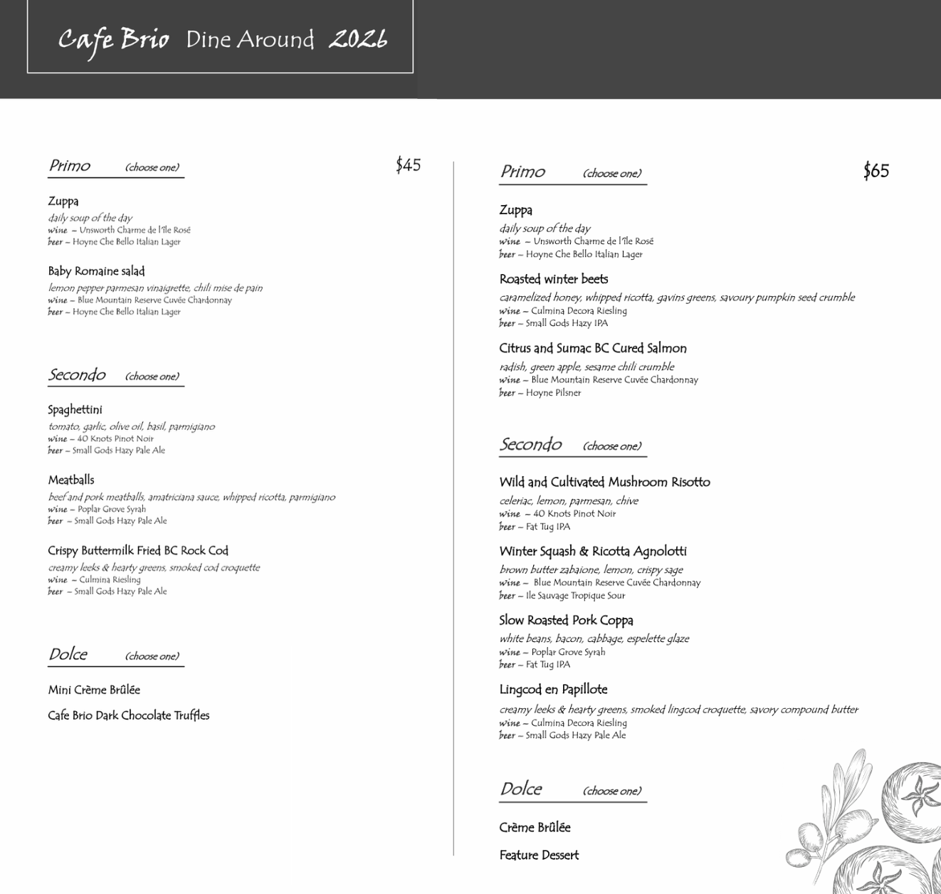 At Cafe Brio, everything is prepared in house. The menu is designed to encourage sharing. Fresh salads, pastas, seafood and meat dishes are available as half portions to allow you to try more.